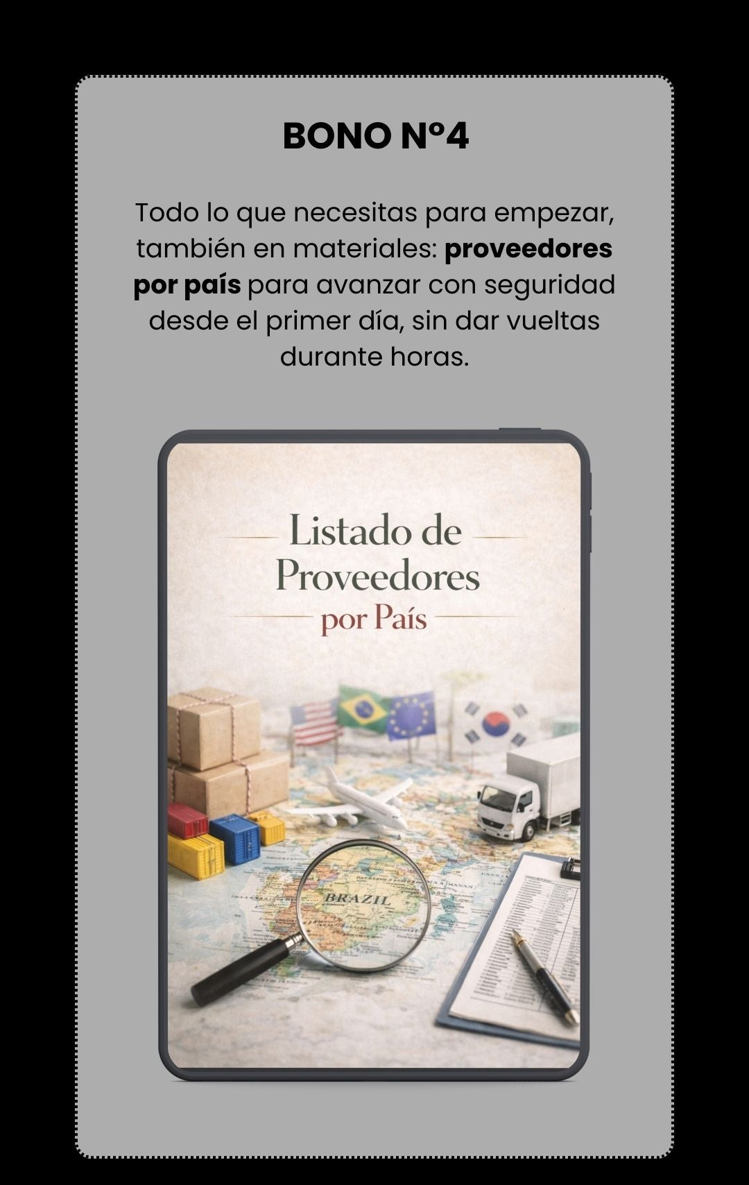 El pack incluye listado de proveedores por país para que no pierdas tiempo buscando ni pagues de más.